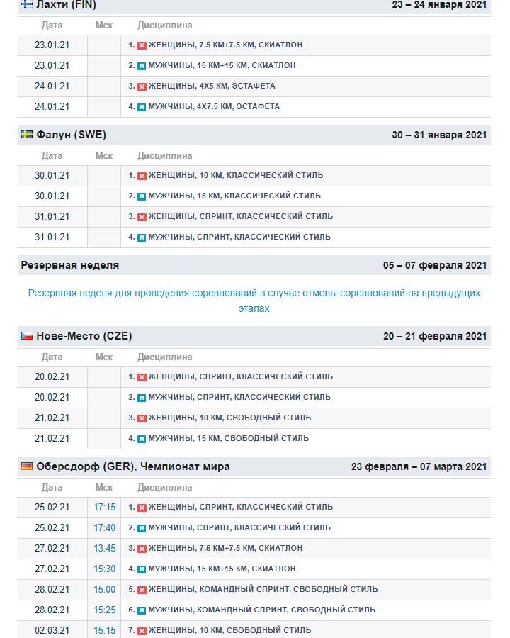 С 5 по 7 февраля 2021 года предусмотрена в расписании Кубка мира по лыжным гонкам 2020/2021 резервная неделя, когда можно провести отмененные на прошлых этапах соревнования.
